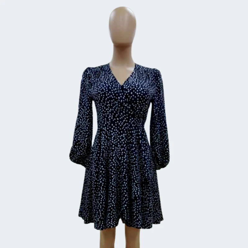 Graceful and feminine, the Starlight Wrap Dress features a flattering V-neck wrap silhouette with soft long sleeves and an all-over dotted print. Designed to cinch at the waist and flow effortlessly, it is perfect for daytime outings, dinners, or special moments that call for understated elegance.
